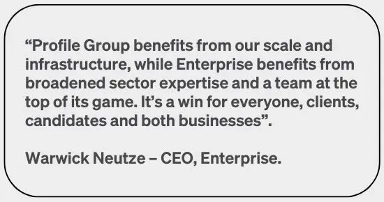 Efficiency & Scale. Enterprise’s established systems and nationwide platform will allow Profile Group to focus on what they do best, high-quality specialised recruitment, while leveraging shared resources for efficiency.